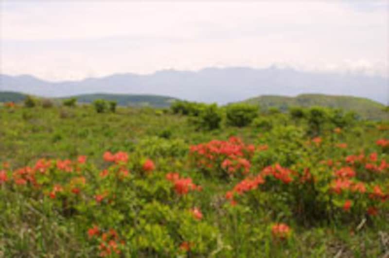 | 車山を望む広い高原で咲く霧ヶ峰のレンゲツツジの群生 |