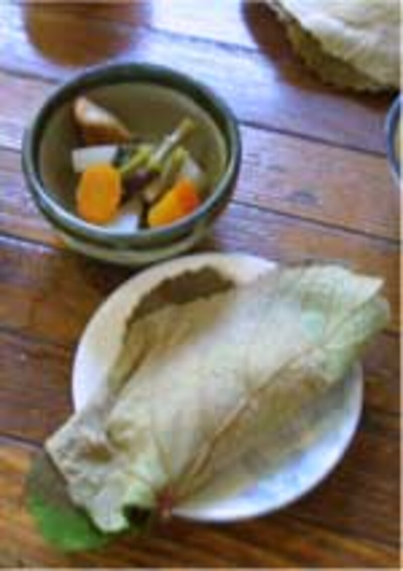 | 野菜の煮物とぶどうの葉で包まれた鱒寿司 |