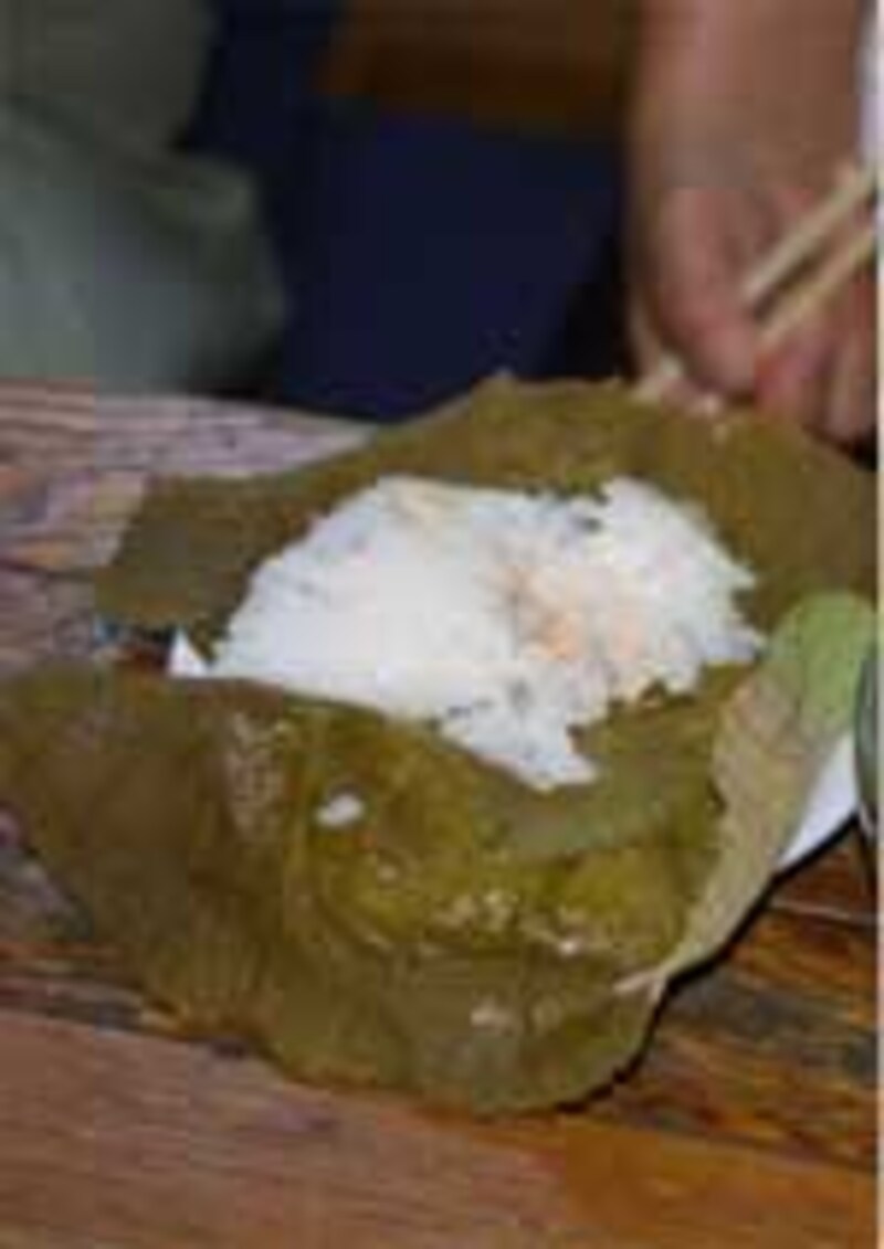 大きなぶどう葉でくるんだ押し寿司は、すし飯の中に焼いた川魚「鱒(ます)」の身をほぐし入れてある。夏~秋にかけてしか食べられない期間限定の料理で、そば定食にしか付かない逸品だ。これもなかなかいける。