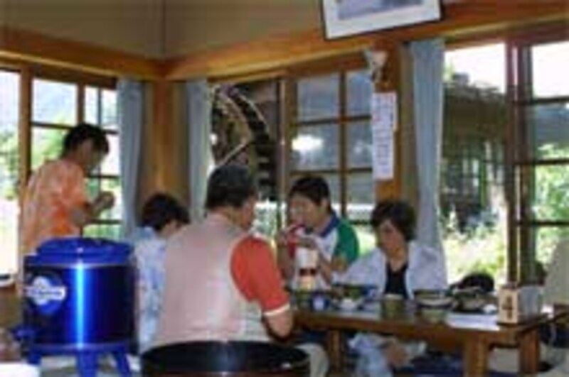 「そば処 いがや」についた時は、昼食時間の前だったから、さすがの人気店も並んでいる待ち客はいなくて、団体24名だったのだが、直ぐに食堂の座卓に座る事が出来た。 店内の食堂は、木造の板張りで、開け放たれた窓からは涼風が爽やかで、明るい心地良い部屋だった。窓からは水車小屋が見え、晴れていると乗鞍岳も見えるというが、あいにく山景色は雲の中だった。