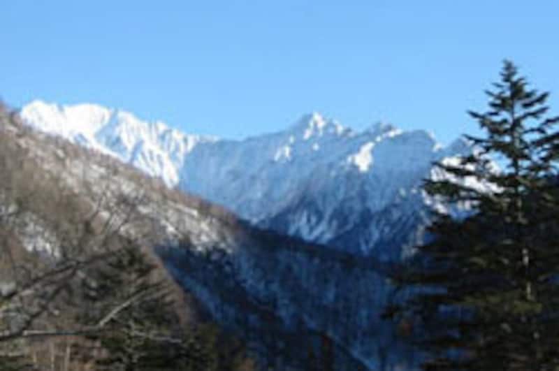 | 中の湯温泉旅館の玄関先から見える白銀の穂高岳・撮影:06/02/18・提供:中の湯温泉旅館 |