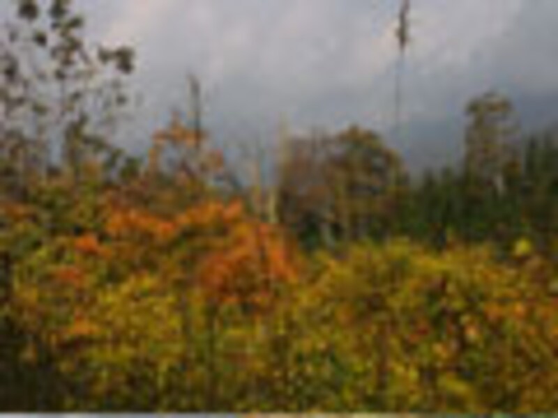 紅葉の名所「天池」は、未だ青葉だったし、鳥甲山は見える筈の展望(台)は生憎雲の中で見えなかったが、時々陽がさす中、色付き始めた紅葉が楽しめた。