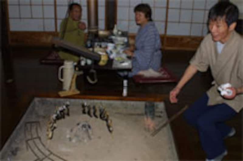 ![]() | 食事処は本家の板敷きの囲炉裏ばた。 |