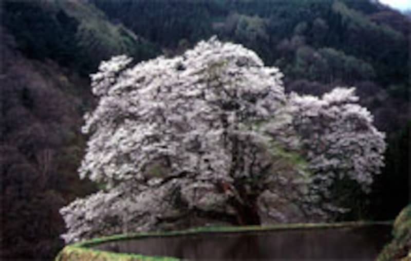 | 阿智村の駒つなぎの桜・樹齢800年・エドヒガン(今年の目安:4/20~4/26);飯田市役所観光課提供 |