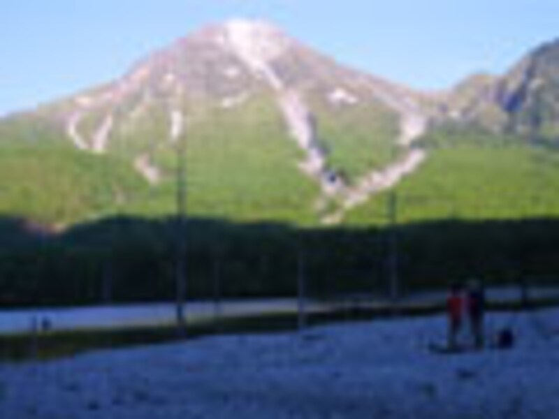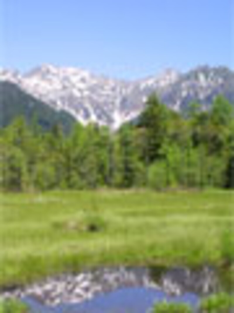 湿原の田代池は、澄んだ水をたたえる浅い池。霞沢岳が正面にあり、朝は特に神秘的です。