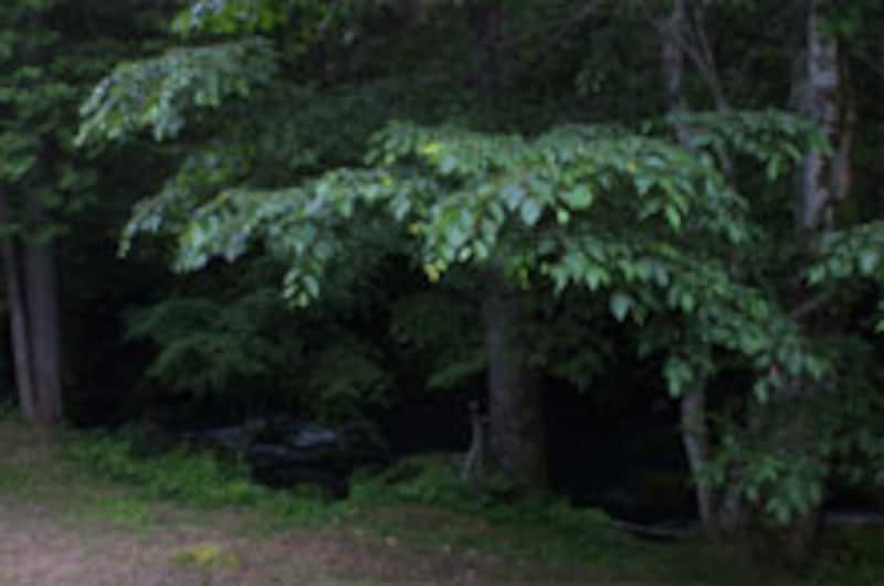 | 渓流・音無川の河原。川岸の木立の緑が爽やか |