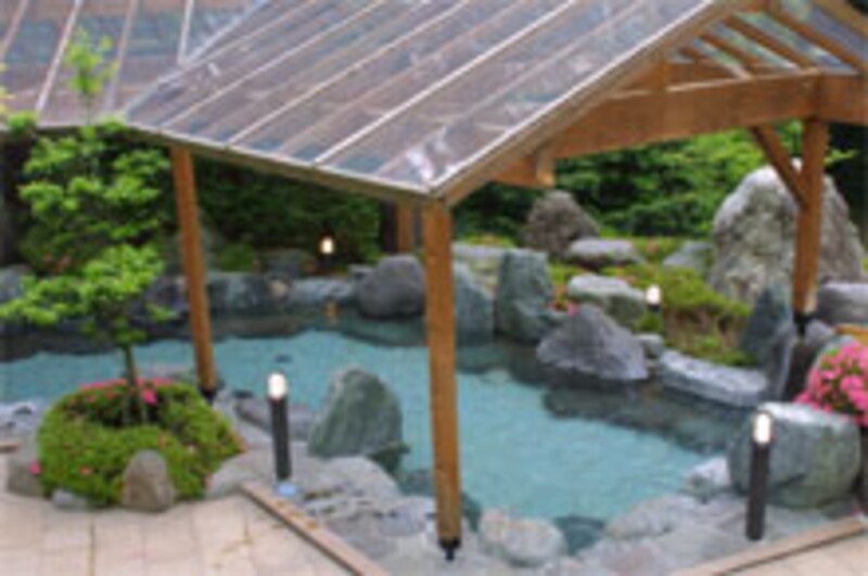 屋根付き、岩組の露天風呂は、無色透明で無臭のアルカリ性単純温泉。 後ろに二つの檜風呂もおかれている。 露天から見下ろす音無川の川縁の木立は、緑が美しく、気持ちが良い。河原と渓流を眺める位置に椅子が用意されていて、入浴でほてった体を涼風をうけて休めることが出来る。