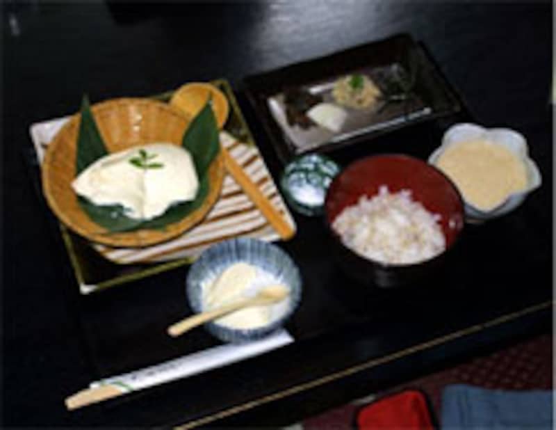 食べてみると納得して頂けると思うが、絶品と言えるような旨い豆腐だ。 メニューは肉の朴葉焼きなどあるが、先ずはお勧めコース(御膳)は、『掬い豆腐』。麦飯とろろ・小鉢・漬け物も付いている。