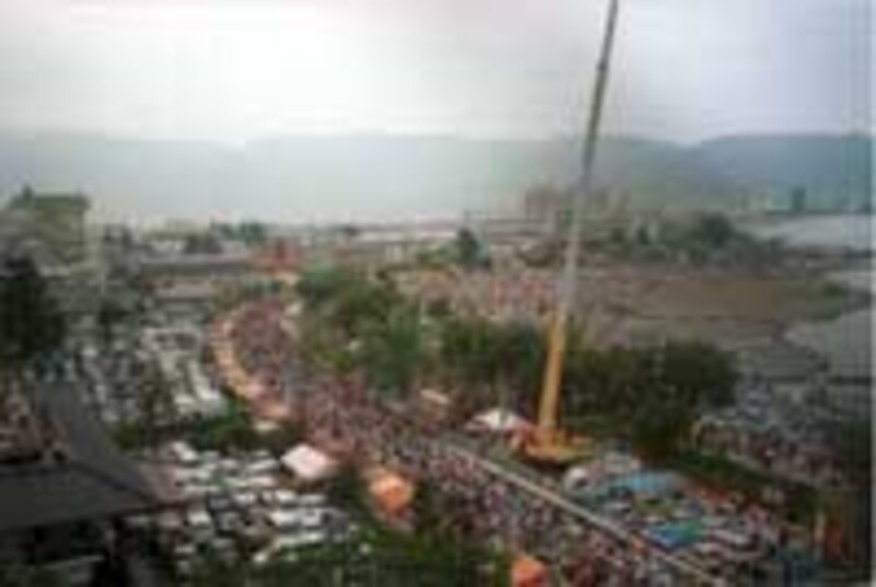 | 観客であふれている当日夕方の湖畔前の様子。初島は右手にある。 |