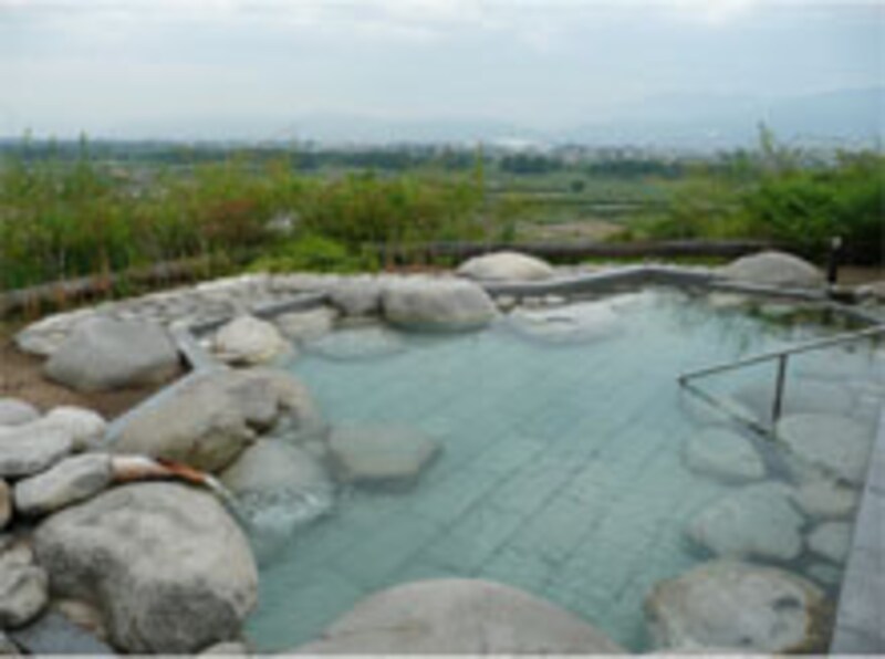 | 石の露天風呂。無色透明で清潔。 眼下に善光寺平(長野市街)が、遠くに北アルプスや飯綱山など北信五岳を望む高台にある |