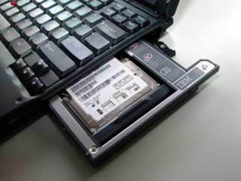 ThinkPad Tシリーズは、HDDと光学ドライブが搭載されたいわゆる2スピンドルのノートパソコンで、光学ドライブ部分を外して、HDDを搭載できる。このような製品の場合、古いHDDを新しいHDDに丸ごとコピーし、新しいHDDに入れ替えるだけで交換は終わる。