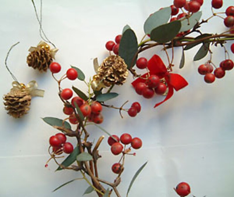 サンキライのツルはよくしなって曲げやすいので、くるくる巻くだけでカンタンにリースができます。良い香りがするユーカリや、市販のベルや松ぼっくりなどを添えれば、にぎやかなクリスマスカラーに!