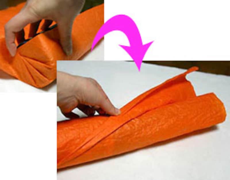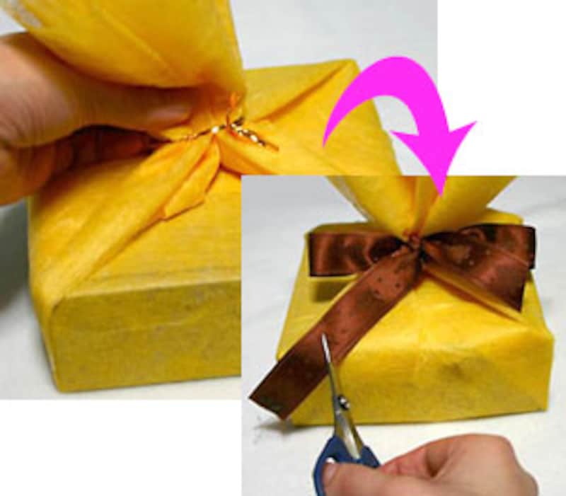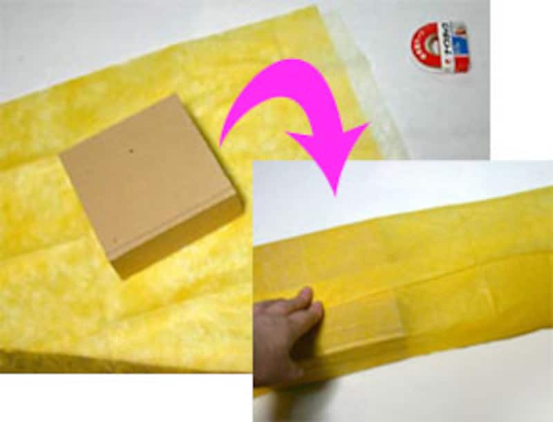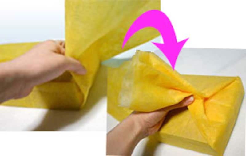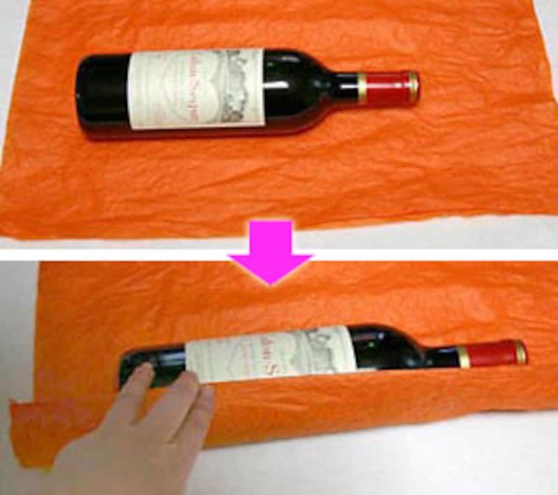 ![]() 【箱の包み方】 1 箱に合わせて長方形のラッピング用紙を用意します。横の長さは縦の2倍必要です。左右には5cmほどの別な紙を両面テープで貼り付けておき、まず上下をくるんでテープで留めます。 ![]() 2 左右の紙を立ち上げます。ここで余分を中に折り込んで、箱の端にきちんと合わせましょう。さらに立ち上げた部分にひだを寄せて、扇のようにたたんでワイヤーなどで仮止めします。 ![]() 3 左右ともひだを寄せて中心でキュッと絞り、ワイヤーで留めておきます。ワイヤーはお菓子の袋などについてくる金色のワイヤーを使用。ワイヤーを隠すようにリボンを結び、余分をカットして出来上がり。 【ワインボトルの包み方】 ![]() 1 ワッシャー加工のクレープ紙を用意。縦のサイズはワインボトルよりも、20~25cmほど長いサイズ、横はワインボトルの円周の2倍ほどのサイズで。 ![]() 2 ボトルを巻き込みながら、底にタックを寄せます。タックは一点に集中するようにするとキレイ。くるくると巻き終わったら、口側は斜めに2~3回たたんでプリーツ状にし、麻ひもで結び、ドライフラワーを差し込みます。カラーの荷札にメッセージを書いて添えるとおしゃれ。 |