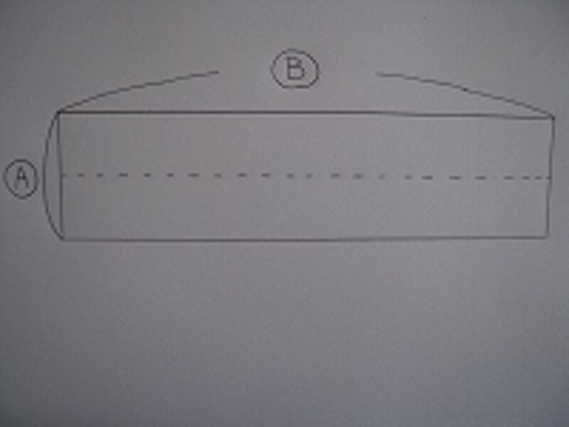 サイズの目安です。タテ(画像A)は、8×10センチほど。ヨコ(画像B)は、50~60センチほど。周囲に1センチ程の縫い代をとって、布を裁ちます。A幅の半分の箇所(画像の点線)が、折り線です。