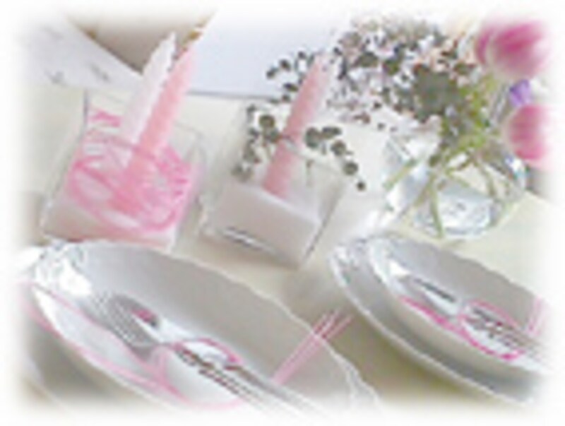 2つ並べたスクエアのガラス花器に、パウダーキャンドルを1/3量ほど入れ、淡いピンクと白のキャンドルを挿しました。
