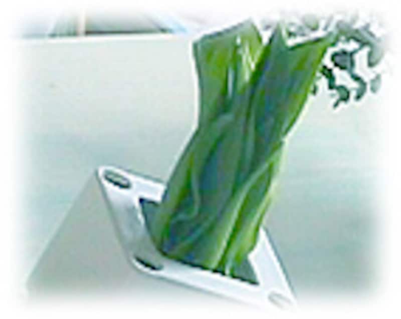 水がよく上がるように切り取るチューリップの葉も、たくさん重ねてひとかたまりにして別の花器に挿せば、春の若芽の勢いのあるイメージに。 |