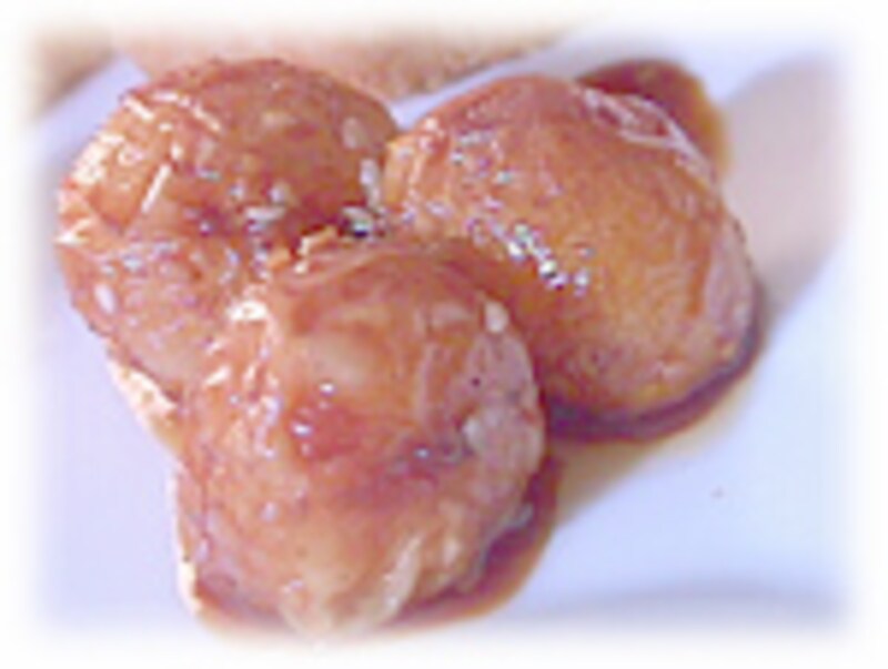 直径2、3センチの皮つきじゃがいもを林檎、赤ワイン、パイン、バナナ、三温糖、ゴマ油などで作るピリ辛のタレでからめ、白ごまを振ってあります。