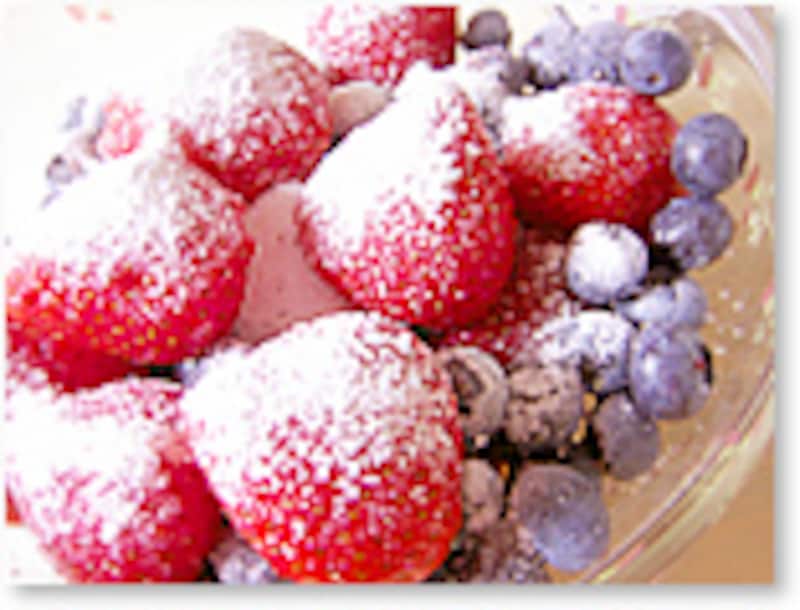 | 香りづけにタイムを加え、砂糖とレモン汁で1晩マリネしたミックスベリーにシャンパンのかき氷を添えた夏向きデザート。乾燥タイムは隠し味なので、ほんのひとつまみ(耳かき一杯程度)の使用にとどめましょう。グラニュー糖と一緒にフードプロセッサにかけ、粉状にしてから使います。