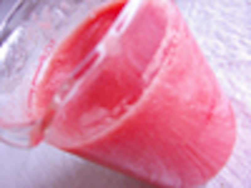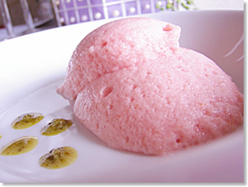 口に入れた瞬間、フワフワとほどけてゆく繊細なバブル。器ごと冷たく冷やして前菜に。ソースは市販のジェノベーゼソースを使うと簡単ですが、フードプロセッサにフレッシュバジルとレモン汁だけを入れてペースト状にしたソースもオススメです。チーズや松の実が入ったコクのあるジェノベーゼ、バジルとレモンの香りのシンプルソース、どちらでもお好みで。 材料も使う器具もとてもシンプルですが、ちょっと大変なのは泡立て。絞りたてのトマトジュースにゼラチンを加えたら、メレンゲのようにきめ細かく泡だった状態になるまで約15分。気長にホイップしてゆきましょう。薄ピンクのフワフワムースにスプーンを入れる瞬間の期待感、そして作る楽しみも味わえるレシピです。 ----------------------------------------------------------------------- |