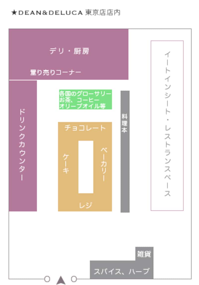 ●DEAN&DELUCA海外第1号店が東京・丸の内にオープン! 全米に13店舗を展開しているNYを拠点とした高級グルメストア、DEAN&DELUCA(ディーン&デルーカ)が、海外1号店を東京・丸の内にオープンしました。DEAN&DELUCAの人気の秘密は、オーナー自らの目利きで世界中から厳選した食材だけを集めた食のセレクトショップであること。「MUSEUM FOR FINE FOOD」をコンセプトとし、オリジナルレシピの高級デリコーナーをはじめ、エスプレッソバー、オイルや調味料、ソースなどの高級グローサリー、お茶、コーヒー、スイーツやベーカリー、そしてトレードマークの銀缶入りのスパイス&ハーブやパッケージギフトフード、日用雑貨まで、約800点の商品が並びます。 デリのお総菜は、このお店で販売している調味料やハーブ、パスタなどを使ってあり、「商品の味を知ってもらうため」という意味も含まれています。「食の販売」ではなく、お金を払う価値のある「食のブランド」として、米国DEAN&DELUCAのエッセンスが凝縮された新しいスタイルの高級グルメストアなのです。 3万円のバルサミコや数千円のジャムなどが並び、「ターゲットは年収5000万円の方々。こんな豊かな食生活ができるのです!」というオーナー発言☆もありましたが、スパイスやハーブ、お茶などは数百円~、ランチは1000円~、ちゃんと楽しめます♪ちょっとした贅沢感を味わえる、というところが受けるのではないでしょうか。 オープン初日、早速足を運んでみました。店内の間取りは以下のようになっています。 ニューヨーク店をご存じの方は、「意外とこじんまりとしてるのね。。。」と感じるかもしれない限られたスペースではありますが、銀缶をはじめとするロゴマーク入りの商品や、1本3万円のバルサミコ酢など世界中から厳選されたグローサリー、極上食材を使ったデリ、そして白・シルバー・グレーを基調とした透明感のあるインテリア。シナトラのBGMが控えめに流れる店内は、既存の高級グルメストアのどことも違う、DEAN&DELUCAだけが持つ魅力にあふれています。DEAN&DELUCAオタクならロゴマークの紙コップまで持ち帰りたくなるほど。(私は持ち帰りました。)