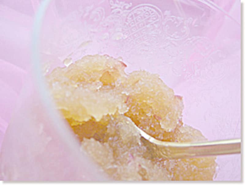 グラニテには果汁を使うのが一般的ですが、赤ワインやシャンパン、リキュールなどのアルコール類を使うこともあります。通常は魚料理と肉料理の間のお口直しに出されるものですが、真夏にはデザートとしてグラスに盛り付けたり、フルーツのシロップ漬けなどと一緒に盛り合わせても涼しげです。