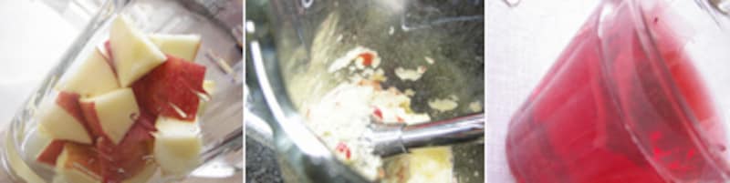 | ★note... りんごはよく洗って皮ごと使います。りんごの中でも「ふじ」は特に変色しやすいので、切ったらすぐにレモン汁をかけておきます。それでも多少の変色はしてしまいますが、真っ赤なローズヒップティーを混ぜるので、仕上がりは茶色がほぼ気にならなくなります。りんごは、ローズヒップティーの他、ハイビスカスティーやカモミールティーとの相性も◎。 |