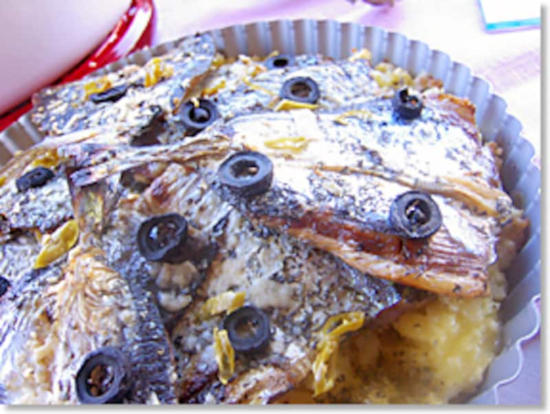 | ★note... じゃがいもだけで作るシンプルなオーブン料理のガレットに、軽くソテーした秋刀魚を載せて焼きました。秋刀魚はもちろん、ジューシーで香ばしい秋刀魚の香りがしみこんだじゃがいもがとても美味。ペペロニは、ワインビネガー漬けにされたグリーンペッパーの瓶詰め。辛みはレッドペッパーよりは穏やかで、肉料理や各種ソースに便利に使えます。冷蔵保存。「ピリリ」が食欲をそそるので、是非揃えて使ってみて下さい。手に入らなければ、緑のタバスコで代用しても。たっぷりふりかけて。 |