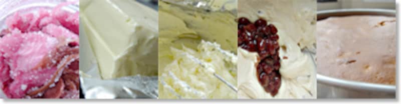 - クリームチーズをレンジで1分加熱し、ボウルに入れる。泡立て器でなめらかなクリーム状になるまでしっかり混ぜる。砂糖30グラム、溶かしバター、卵黄、サワークリームの順に丁寧に混ぜ合わせていく。最後にゆであずきと塩抜きした桜のみじん切りを加えて混ぜる。オーブンを180度に予熱しはじめる。