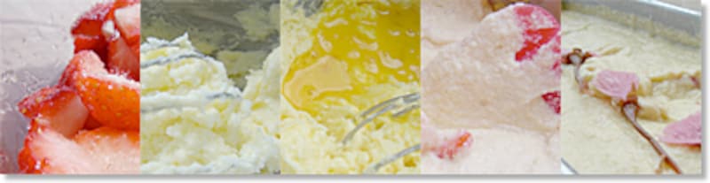 - 桜の塩漬けは塩を洗い流した後、大きめの器に入れてたっぷり水を張り、塩抜きしておく。無塩バターは室温に戻しておく。型にバターを塗り、薄力粉(分量外)をふって余分な粉をはたき、冷蔵庫で冷やしておく。卵を溶きほぐす。いちごは7~8ミリに刻んでキルシュと分量の中の砂糖を大さじ2をふりかけておく。薄力粉とベーキングパウダーを合わせてふるっておく。オーブンを190度に予熱する。