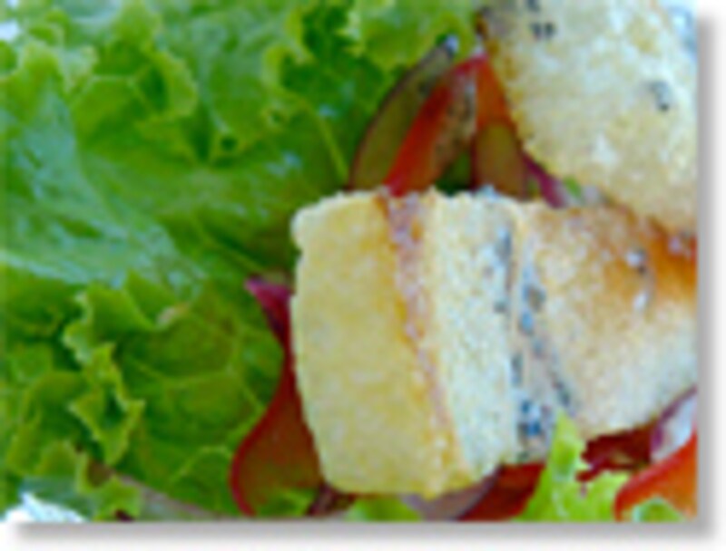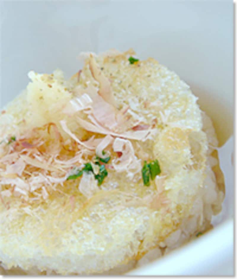 松山あげでリゾットを挟んだミルフィーユ。コンソメやチーズの味と、表面をカリカリにあぶったおあげの大豆の深い香りは意外と相性が良いのです。 チーズ味のリゾットのかわりに、和風の炊き込みごはんやおこわ、ピラフなど何を挟んでも良さそう。 挟むごはんの味によって、トッピングするのはわさびなのか、山椒なのか、黒こしょうなのか、味噌なのか、、ピッタリの組み合わせを試してみて下さいね。 ◆◆ serves 2 松山あげ…1枚 米…1/3合 玉ねぎのみじん切り…大さじ2 ごぼうのささがき…10センチ分 すりおろしたホースラディッシュ(なければマスタード等)…少々 オリーブオイル…少々 コンソメキューブを溶かしたスープ…200cc 生クリーム…大1 パルメザンチーズのすりおろし…大2 黒こしょう…少々 (1) リゾットを作る。オリーブオイルを熱したフライパンで米を炒め、透明感が出てきたら玉ねぎのみじん切りと水にさらして水気をよく切ったごぼうを入れ、よく炒め合わせる。スープを加えて中弱火で時々混ぜながらリゾットを作る。途中水分が足りなくなったら水を少しずつ足す。 (2) お米がアルデンテになったら塩、こしょうで味を調え、生クリームを加えて水分を飛ばし、パルメザンチーズのすりおろしを混ぜる。 (3) 松山あげをセルクルで4枚抜き、油をひかない熱したフライパンで両面きつね色にこんがり焼く。(焦がさないように注意!) (4) 皿におあげを1枚乗せ、セルクルをかぶせる。2のリゾットを、1センチくらいの高さになるようにセルクルに詰める。もう一枚おあげを乗せて、セルクルを抜く。 (5) ホースラディッシュのすりおろし、黒こしょう、あればシブレットを飾る。 【もうひとつの食べ方】 上記のレシピで作ったミルフィーユを深めの器に盛りつけ、リゾットが半分くらい浸かる量のコンソメスープを張ります。 これで、下のおあげはスープを吸って生麩のようにモチモチになり、上のおあげはパリパリのまま!2つの食感を同時に楽しめるのです。 ※写真は和風の炊き込みご飯を挟んで鰹だしを張り、かつおぶしとショウガのすり下ろし、粉山椒をトッピングしています。  ̄ BGM for MATSUYAMA AGE この料理と一緒に聴きたいCD ̄ CELLO SUITE 1.2.3. (YASUAKI SHIMIZU ) 松山あげを定番のサラダに。パリパリとしたこの食感は…… ほら、アレに似ていますね! ドレッシングに黒ごまをたっぷり。>> <<前へ 1 / 2 / 3 次へ>> 【編集部おすすめの購入サイト】Amazonで人気レシピの書籍をチェック!楽天市場で人気レシピの書籍をチェック!※記事内容は執筆時点のものです。最新の内容をご確認ください。※衛生面および保存状態に起因して食中毒や体調不良を引き起こす場合があります。必ず清潔な状態で、正しい方法で行い、なるべく早めにお召し上がりください。また、持ち運びの際は保存方法に注意してください。