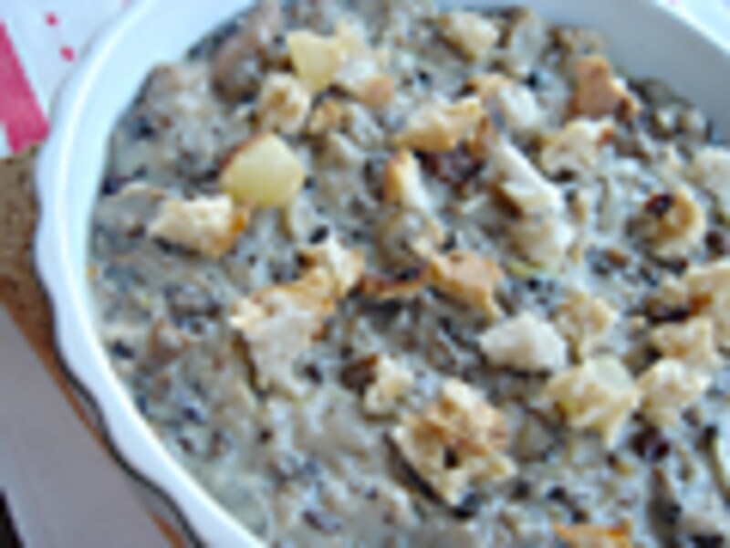 食べきれずに残ったパンの美味しい食べ方。ドライフルーツやナッツ類が入ったライ麦パンに、野性味のある素材を合わせてみましょう。たっぷりのマッシュルームと一緒にロワイヤルにしてみました。