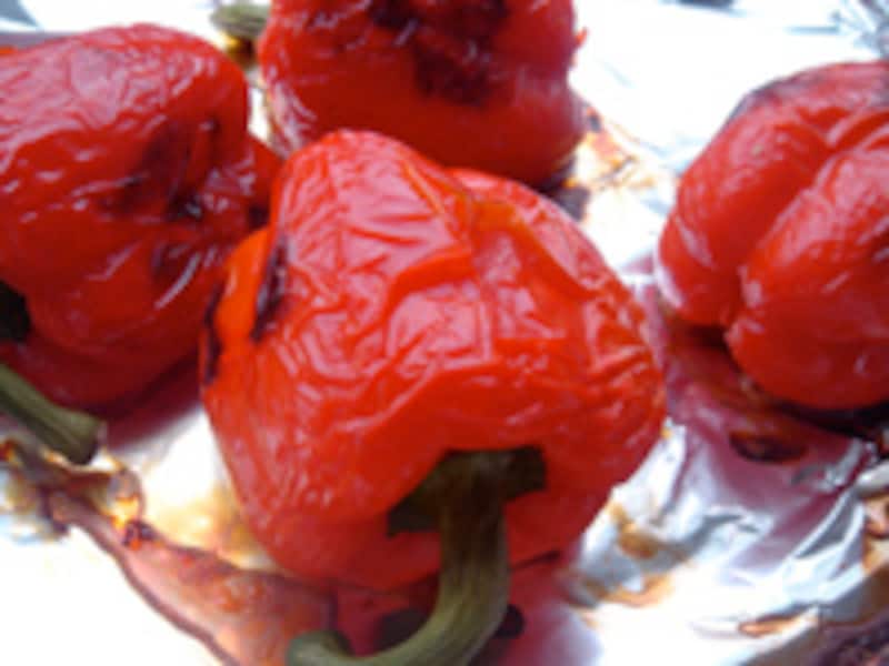 1:赤ピーマンを200度のオーブンに入れて30分、時々返しながらじっくりと焼く。全体に焼き色がついたら取り出して、ポリ袋に入れて10分ほど蒸らす。(皮がむきやすくなります)皮、種、へたを取る。縦に半分に切っておく。