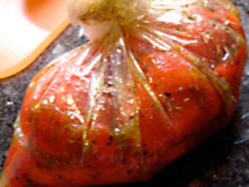 2:温かいうちにオリーブオイル大さじ2,レモン汁1/2個分、ディルの葉3本分、にんにくのすりおろし、塩、こしょうを混ぜたマリネ液をビニール袋に入れてピーマンも入れ、空気をぬいて口を縛って結んでおく。最低30分マリネしておく。