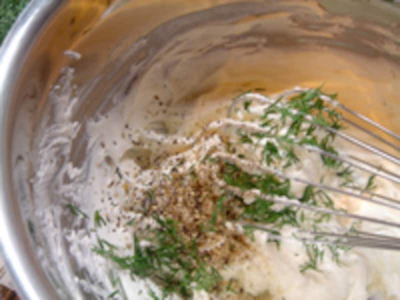 3:赤ピーマンを焼いている間にフロマージュ部分を作る。板ゼラチンをたっぷりの水にふやかす。レンジで完全に液体にしておく。(沸騰させないこと)生クリームを堅くホイップする。別ボウルでフロマージュブランを泡立て器で柔らかくし、生クリームをあわせてゆく。ディルのみじん切り(2本分)挽いた黒こしょうたっぷり、とかしたゼラチンを加えていく。味を見ながら塩を小さじ1/2~1程度入れる。うす塩味になるように。