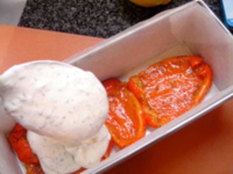 4:型にワックスペーパー、またはラップをきっちりと敷きこみ、赤ピーマンの水気を軽く切って底を覆うように入れる。次に3の生地をピーマンが隠れるまで入れ、またピーマンを重ねる。この繰り返しで最後に生地が上に来るように繰り返す。ラップできっちりふたをして、冷蔵庫で2時間ほど固める。