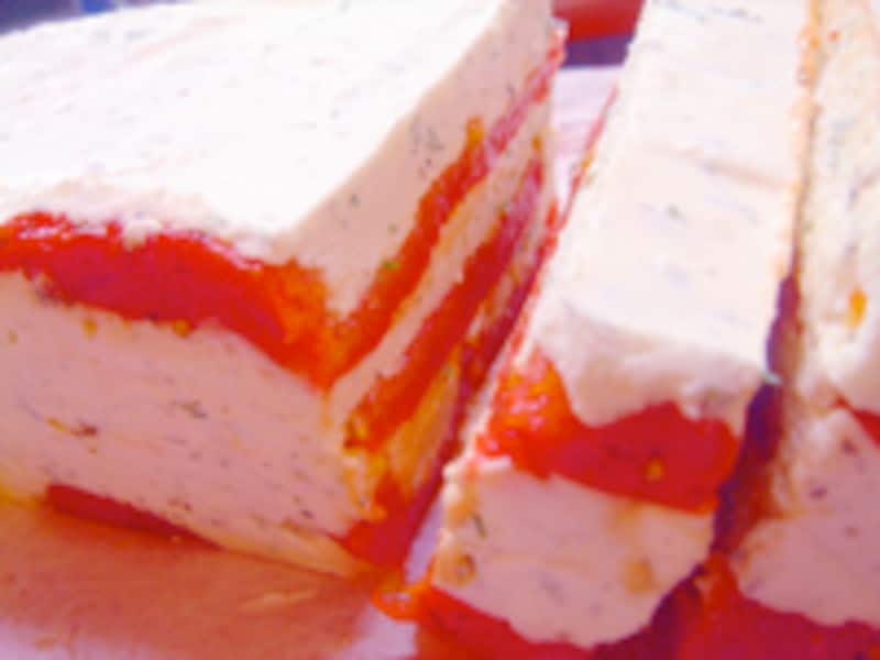 | 赤ピーマンとチーズクリームの2種類を重ねていくだけで、前菜にふさわしいテリーヌができあがります。 |