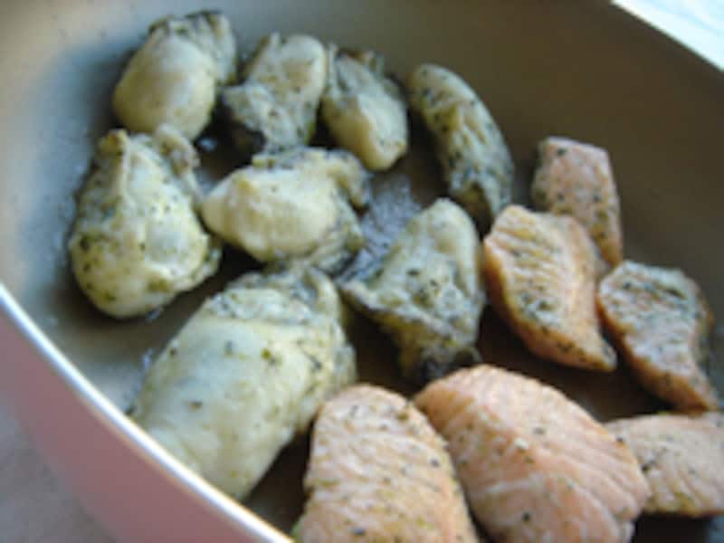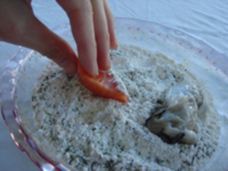 3:生鮭と牡蠣に、小麦粉大4と緑茶小1を合わせたものを薄くまぶし、余分な粉をはたく。