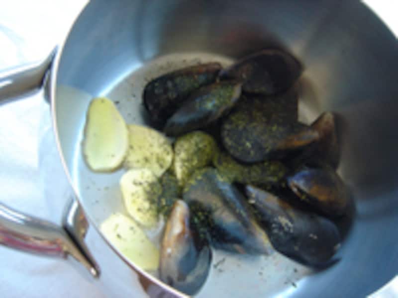 5: 鍋にサラダオイル少々とにんにく、しょうがを入れ、火にかける。いい香りがしてきたらムール貝と緑茶小1を加え、ふたをする。1分経ったら白ワインを注ぎ、ふたをして貝の殻が開いたら火を止める。