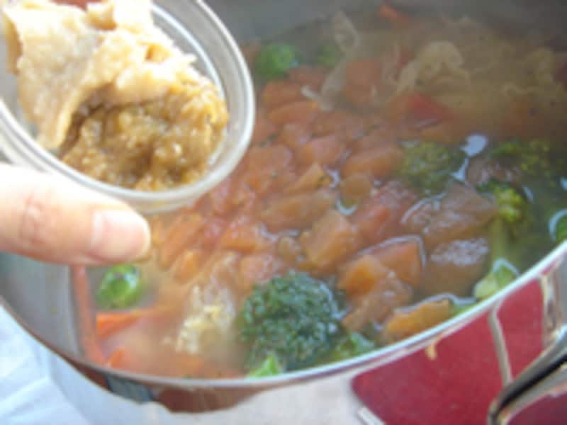 6: ムール貝を取りだした鍋にブロッコリー、にんじん、芽キャベツ、白キクラゲを入れ、だしを加えて火にかける。ふたをして沸騰したら弱火で7~8分煮込む。芽キャベツが柔らかくなっていたらトマトとみそを溶き入れ、さらに4~5分煮込む。