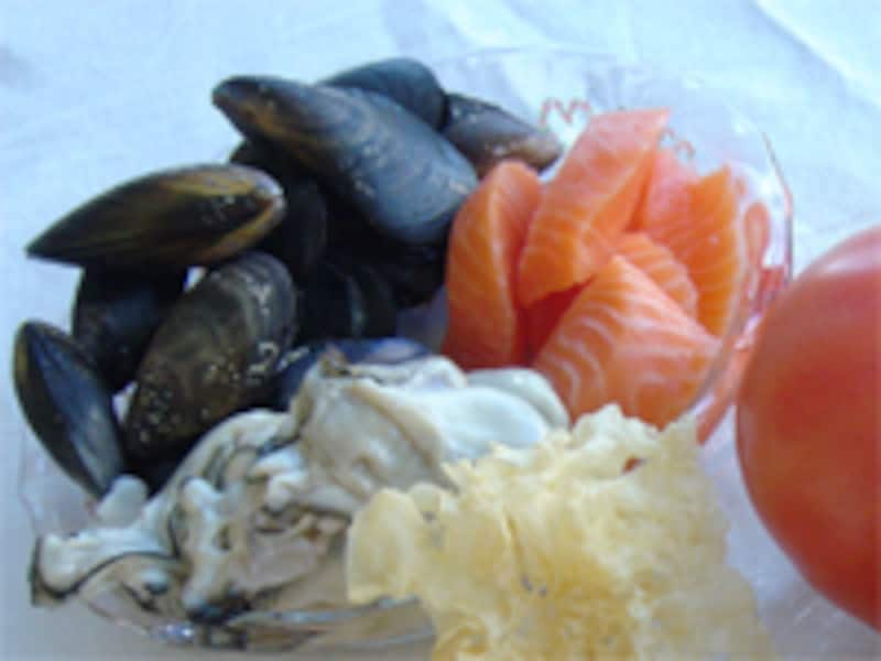 1:生鮭は皮と骨を取り除き、大きめの一口大に切る。ムール貝は殻をこすり合わせるようにしてよく洗い、繊維状の足糸を引き抜いて水気を切っておく。牡蠣は塩で軽くもんで、流水の下で丁寧に水洗いし、水気を切っておく。白キクラゲはたっぷりの水で柔らかくもどし、ほぐしておく。