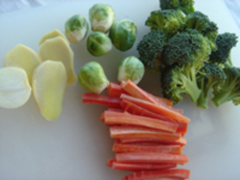 2:にんにくは半分にスライスし、ブロッコリーは小房に分ける。ニンジンは太めの拍子木切りに。芽キャベツは汚れている葉をはがしてキレイにする。トマトは横半分に切って種をくりぬき、皮をむいて1センチ角に刻む。