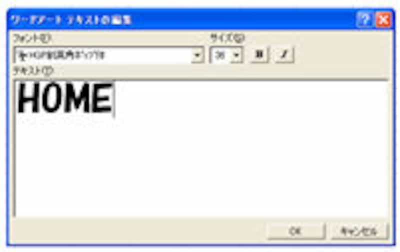 (3)文字をいれましょう。Excelのメニュー「挿入」→「図」→「ワードアート」を選択して、ワードアートギャラリーから好みの字体を選んでダブルクリックしてください。特に変形をかけたくないなら一番左上をどうぞ。