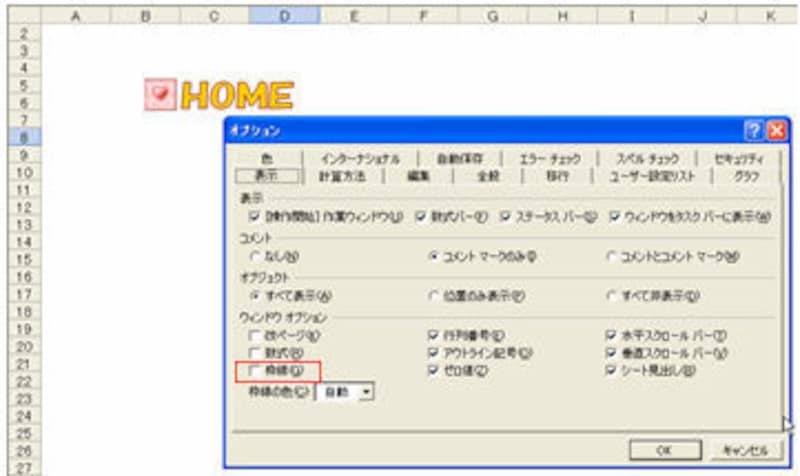 (6)先に用意した図と組み合わせます。この段階でそれぞれのパーツの大きさを完成段階のものに調整しましょう。でも、ワークシートの枠線が邪魔ですね。これを非表示にしましょう。Excelのメニューの「ツール」→「オプション」で、「表示」タブのウインドウオプション「枠線」のチェックをはずしてください。