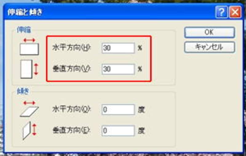 (2)「伸縮」パラメータとして、縮小比率をそれぞれ縦横で指定。基本的には、両者とも同じ値にしましょう。