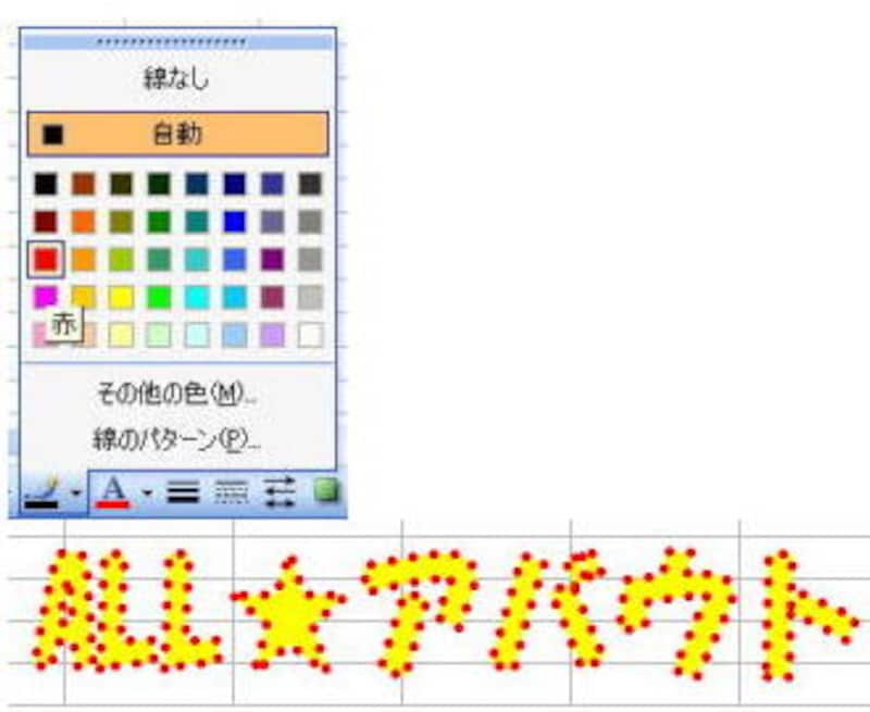 【2】図形描画ツールバーの「塗りつぶしの色」ボタンの横にある▼をクリックして、好みの色を選びます。ここでは黄色を選んでみます。文字の色が変わりましたか?