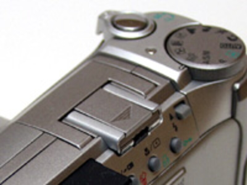 | C-740とC-750を並べてみた。外見からはほとんど区別がつかない。筐体の一部に黒いプラスティックが使われているのが、C-740だ。 | C-750にはオリンパス製のフラッシュを接続するシューが装備された。FL-40/FL-20が利用できる。 |