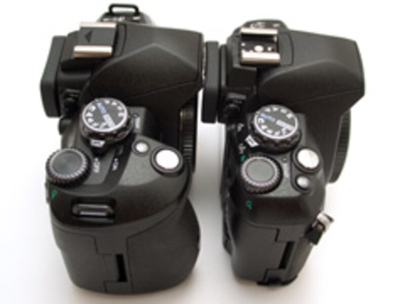 | ▲E-510とE-410を横から比べたところ。グリップがかなり大振りなのが分かる。 |