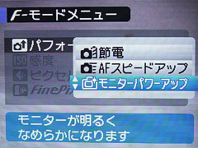 | ▲炎天下などで液晶ディスプレイが見にくい場合はパワーアップに設定を。 |