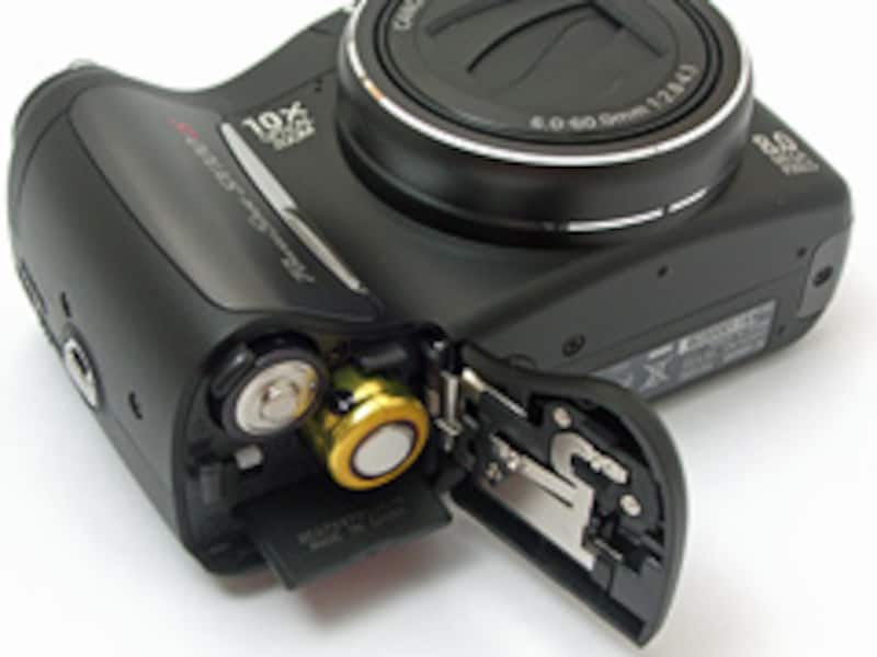 PowerShot SX100ISは単三乾電池2本を採用している。