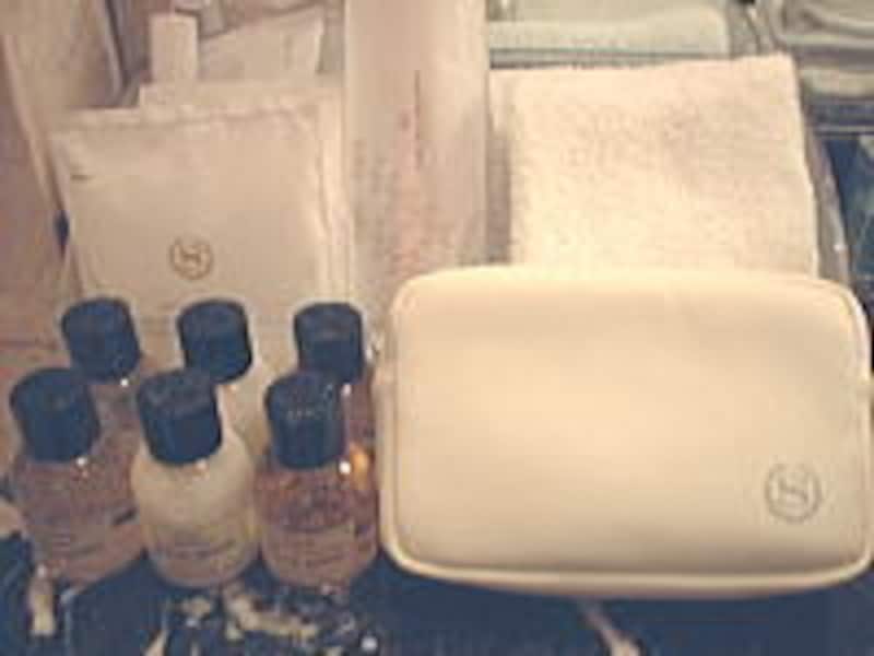 息をのむすばらしさの夜景! 六甲山麓を望むお部屋からは、180度に広がる阪神高速の行きかう車のヘッドライトも美しいロマンチックな夜景を楽しめます。![]() ポーチにはヘアバンド、コットン、化粧水や乳液など。 |
